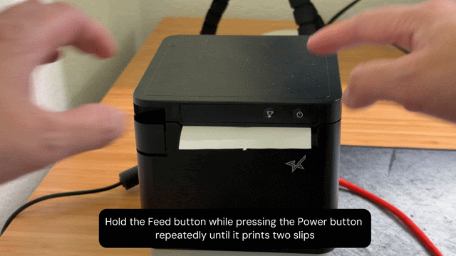 - On the front, press and hold the FEED button and while tapping the Power button turn on the printer.