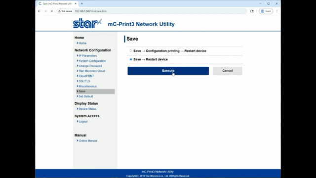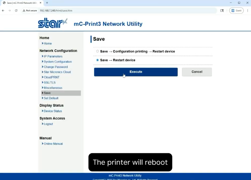 - When prompted, select Save --> Configuration printing --> Restart device.