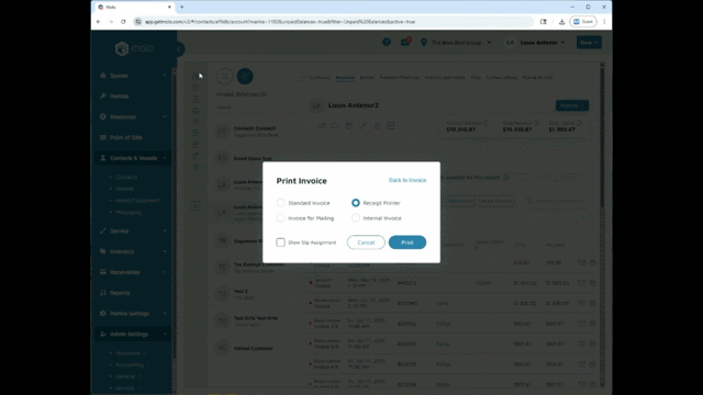 Contacts and Vessels > Contacts > Select a Contact > Select the printer icon on an Invoice > Select Receipt Printer in the popup > click Print.