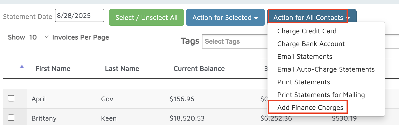 - Action for All → Add Finance Charges — to apply charges to everyone on the list.