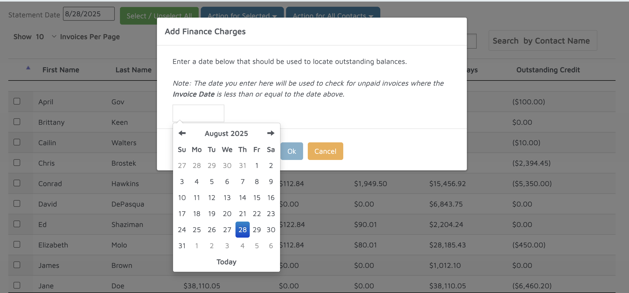 - If you use Add Finance Charges and a selected customer does not have an outstanding balance as of the date selected (e.g. they are in good standing), no finance charge will be added, regardless of if they are selected or not!