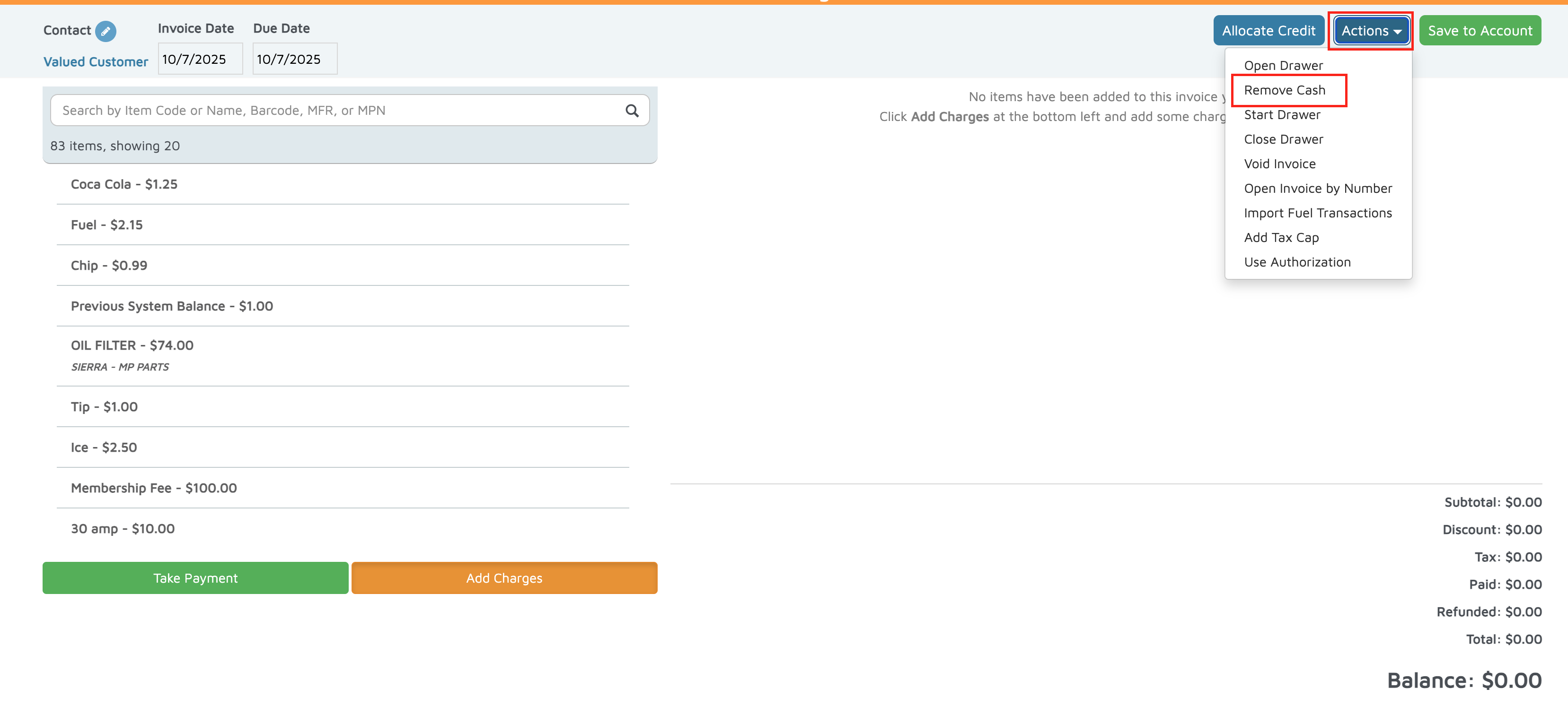 - On the Point-of-Sale screen, click on Actions.