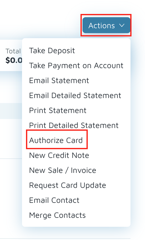 - Go to Contact & Vessels → Contacts → Select a contact → Actions and choose Authorize Card.