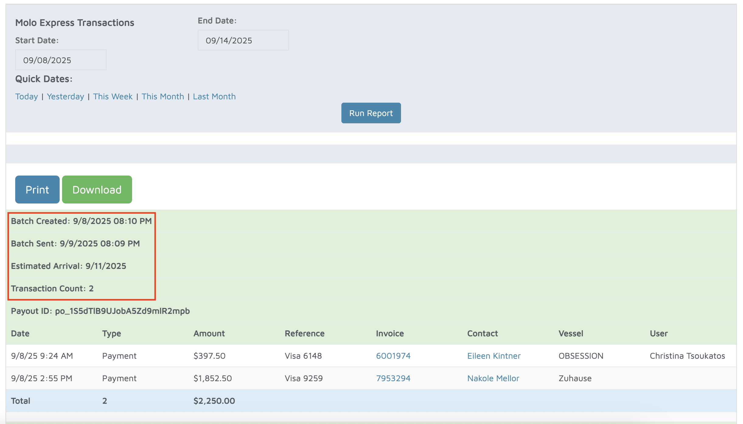 - "I processed payments in Molo — how do I track when they will hit my bank and see transaction details?"