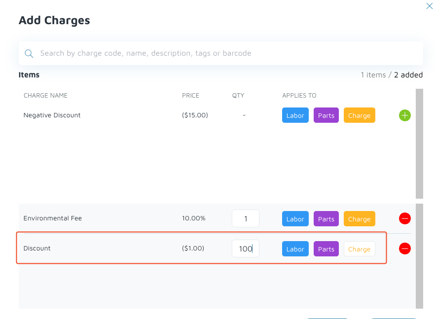 - Set the quantity as the desired dollar amount to discount (e.g. set quantity to 100 since -$1.00 x 100 = -$100).
