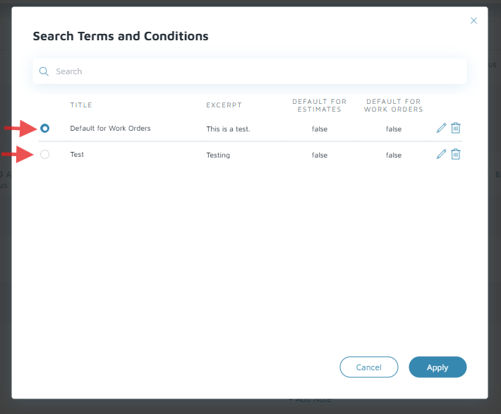 Verification/Confirmation: Terms and Conditions can be found by clicking on an Estimate or Work Order, scrolling down to the Terms and Conditions section, then clicking on Search Terms and Conditions to see the new item.