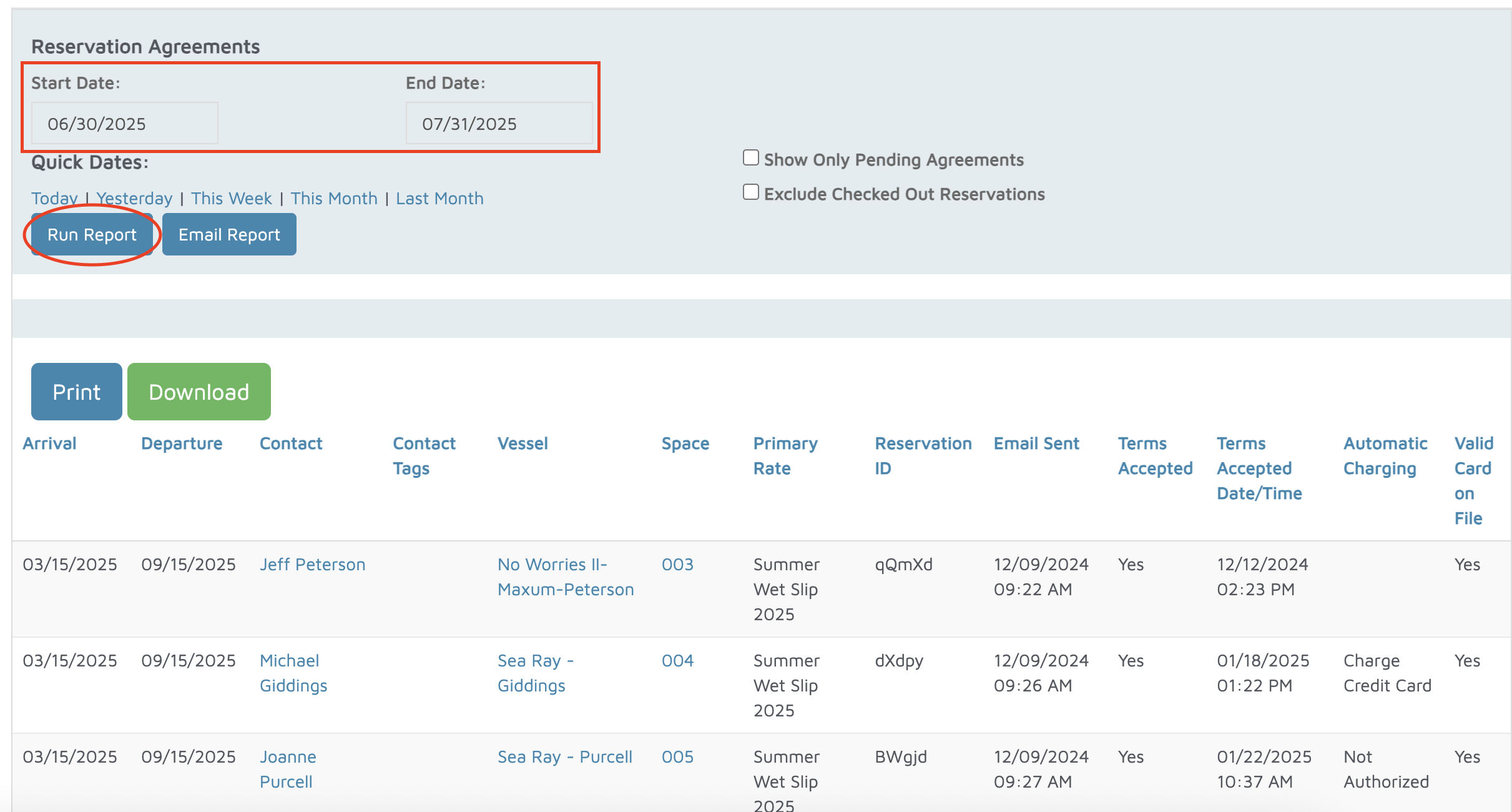 - This report lists all reservations within the selected timeframe, indicating whether their terms were accepted, along with the date and time of acceptance.