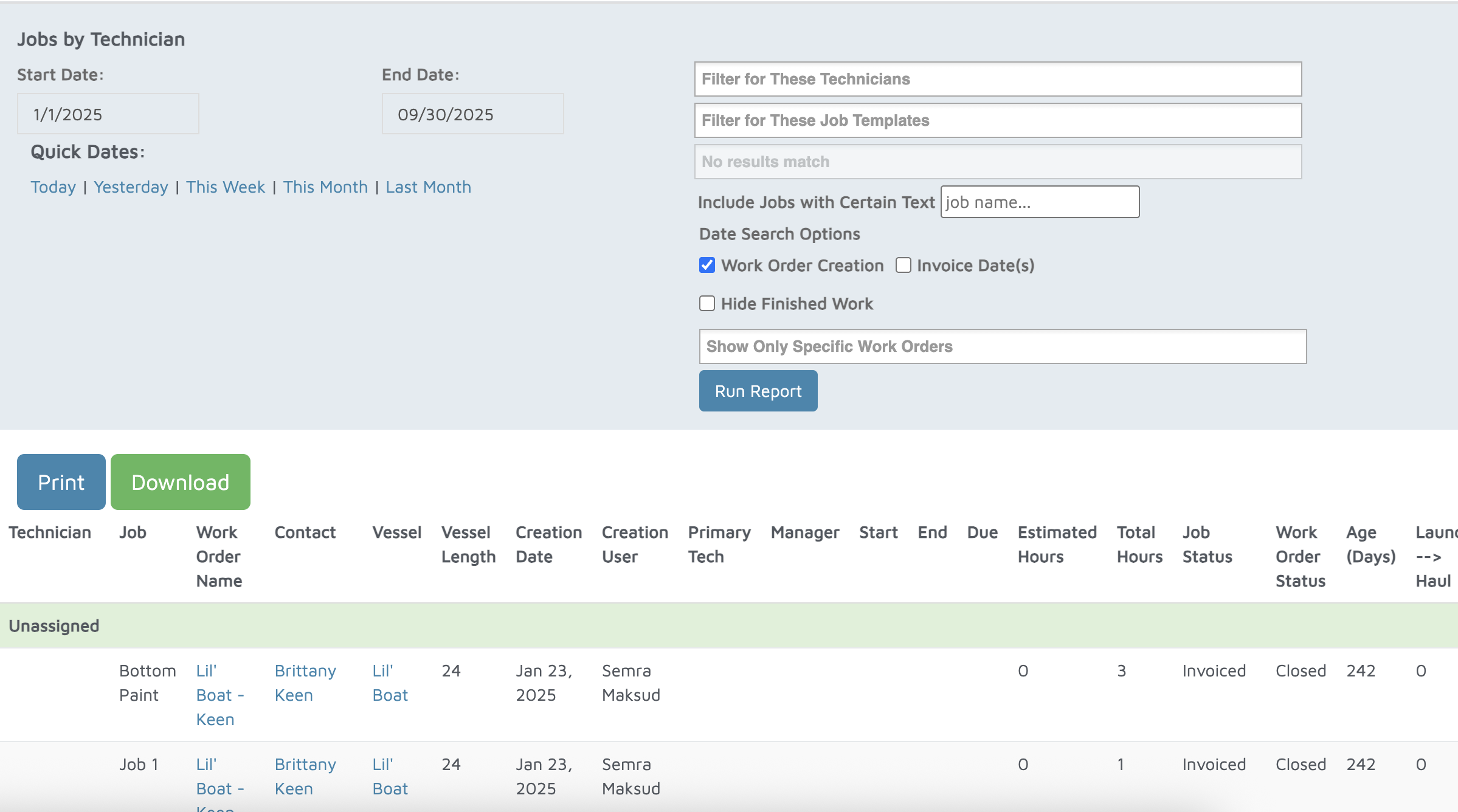 - The report will group jobs by technician and display: