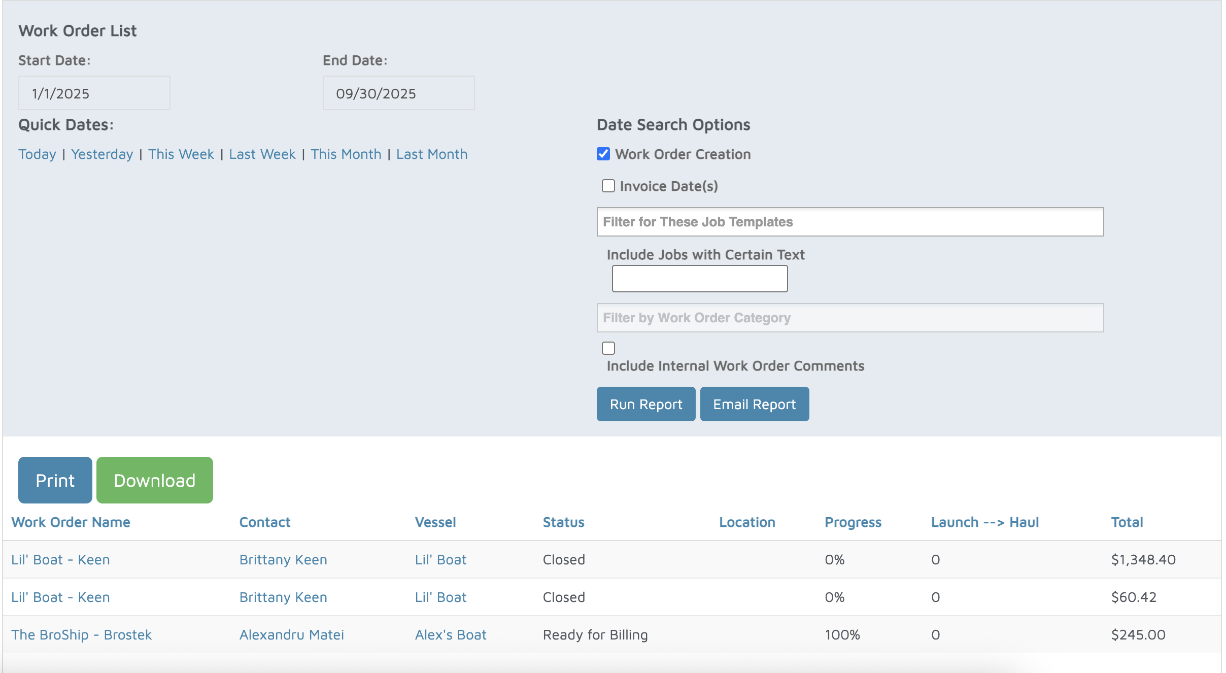 - "How do I view a list of all work orders, their details, and statuses within a selected timeframe?"