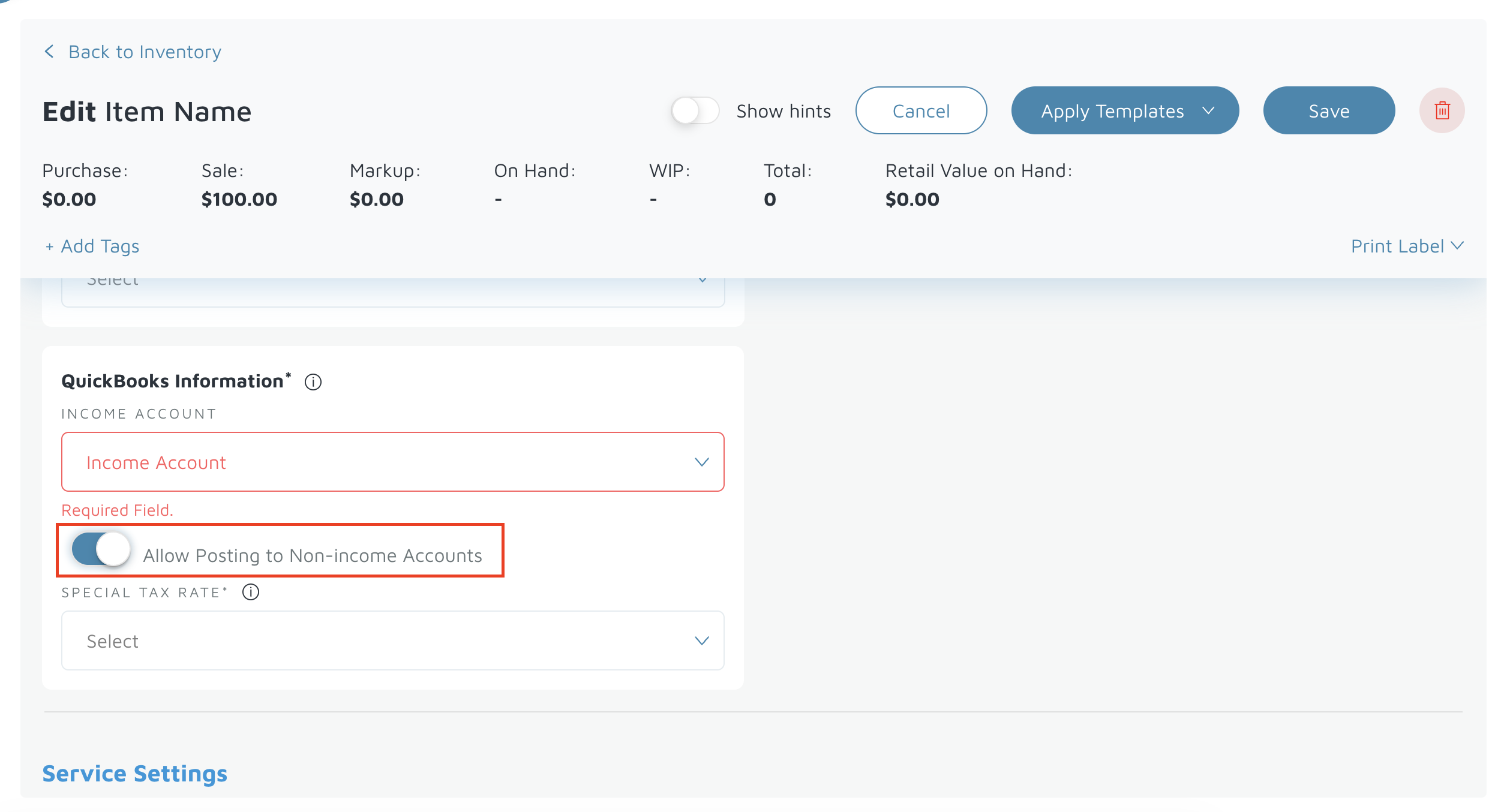 - Toggle this setting ON to enable selecting accounts that are not income accounts.